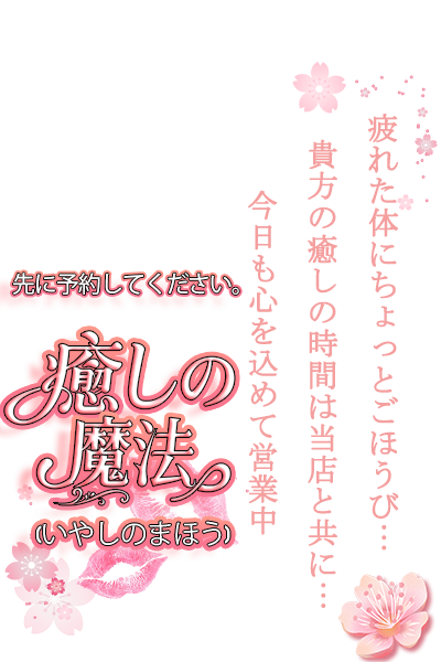 癒されるマッサージと気軽なコミュニケーションが楽しめる当リラクゼーション。当店は単にマッサージをして身体を癒すだけではなく、疲れた心を含めて最高にリラックスでき癒しマッサージを体験して頂けるよう日々努力しております。日ごろの疲れを綺麗なセラピストがほぐします。ゆったりと甘いひと時をお過ごしください。